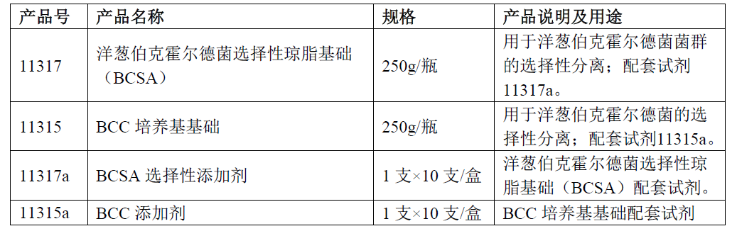 目前,北京三藥針對洋蔥伯克霍爾德菌的檢驗開發(fā)了兩種培養(yǎng)基,洋蔥伯克霍爾德菌選擇性瓊脂基礎(chǔ)(符合USP)和BCC培養(yǎng)基基礎(chǔ)以及對應(yīng)的配套試劑。