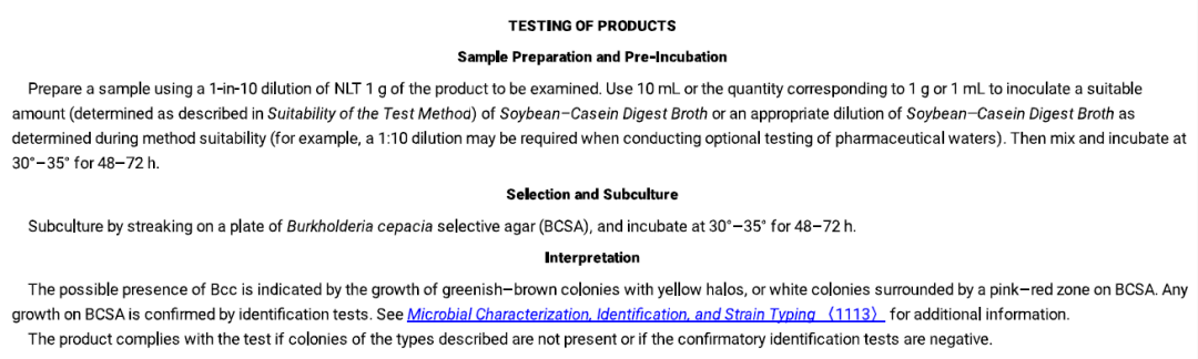 最開始,洋蔥伯克霍爾德菌并未被列入USP的控制菌檢查范圍內(nèi),它對藥品的潛在威脅性是在20189月底舉行的PDA/FDA會議中被提出。目前,USP<60> MICROBIOLOGICAL EXAMINATION OF NONSTERILE PRODUCTSTESTS FOR BURKHOLDERIA CEPACIA COMPLEX已于2019121日生效,正式將洋蔥伯克霍爾德復合體納入了USP控制菌檢查項目。