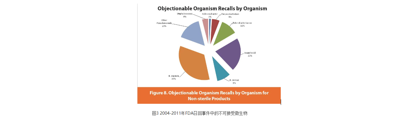 FDA召回的非無菌產(chǎn)品中,洋蔥伯克霍爾德菌(B.cepacia)污染是涉及召回次數(shù)最多的微生物污染召回事件,在2004-2011FDA召回事件中的不可接受微生物,占三分之一的污染微生物為洋蔥伯克霍爾德菌(Burkholderia cepacia)。